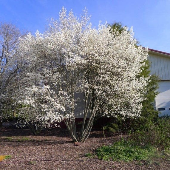Upright shrub often has several trunks.Glossy green foliage emerges a bronzey purple and turns yellow-red in fall. Showy white flowers bloom in early spring.
