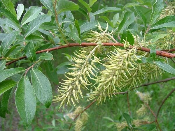 Upright, dense, multi-stemmed shrub with spreading branches (red when young maturing to a hairy gray) has oval shaped green foliage with white, fuzzy undersides. Flowers are dioecious; yellow-white catkins in spring. Full sun.