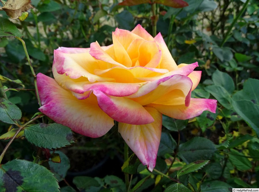Beautiful bright yellow blooms with red edges on outer petals. Blooms in flushes throughout the season. (Meilland International 1992)