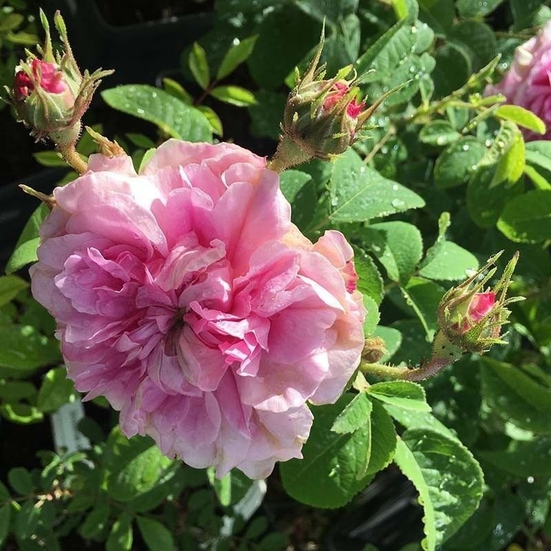 Damask rose offers a strong, centifolia-old rose fragrance; Average diameter 2" pink, double blooming (up to 30 petals) have white undertones and age lighter; Blooms are in small clustered and flat bloom form; Once-blooming spring or summer. Small, glandular sepals, leafy sepals buds. Bushy and upright habit; Well-branche with medium green foliage and 7 leaflets; Very thorny, vigorous growth and can reach up to 6 feet it width; Prune after flowering is finished; this rose blooms on old wood. Bred by Unknown (before 1612). Introduced in Germany by Dr. Georg Dieck in 1889 as 'Rosa damascena var. trigintipetala'. Introduced in France by Eugene Turbat & Co. in 1930 as 'Professeur Émile Perrot'.