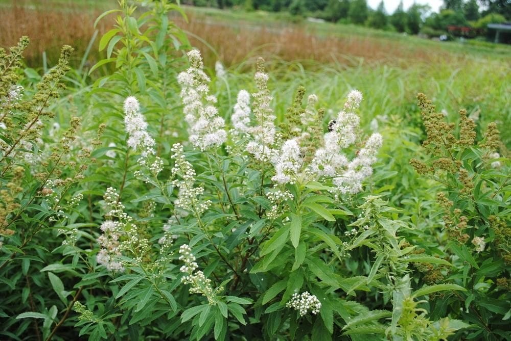 Upright, deciduous shrub with dark red stems. Dark green, serrated, narrow foliage grows opposite. Mid summer blooms clusters of white flowers on panicles. Thrives in moist meadows and at the edges of marshes.